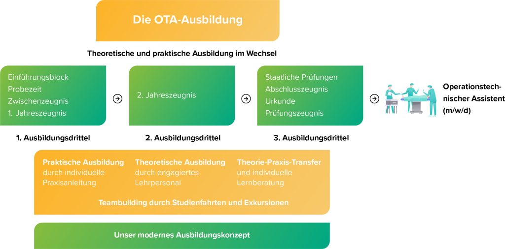 Die Ausbildung zum Operationstechnischen Assistenten (m/w/d) dauert drei Jahre und gliedert sich in 2.100 Stunden theoretischer Unterricht und 2.500 Stunden praktische Einsätze. Sie endet mit der staatlichen Prüfung, bestehend aus einem schriftlichen, einem mündlichen und einem praktischen Teil.