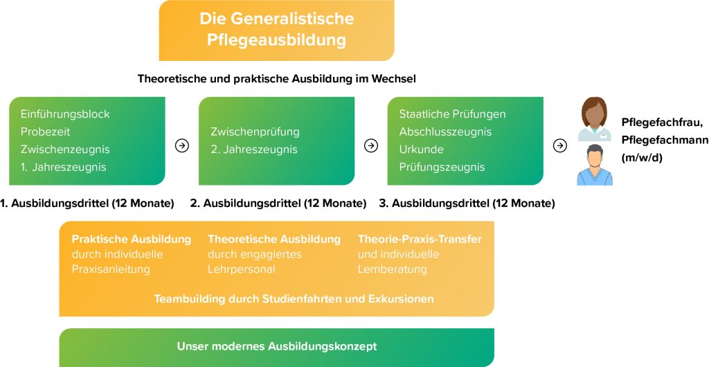 Die Ausbildung zur Pflegefachfrau/zum Pflegefachmann (m/w/d) dauert drei Jahre und gliedert sich in 2.100 Stunden theoretischer Unterricht und 2.500 Stunden praktische Einsätze. Sie endet mit der staatlichen Prüfung, bestehend aus einem schriftlichen, einem mündlichen und einem praktischen Teil.
